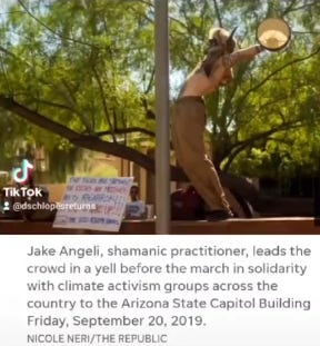 Jacob Chansley (aka Jake Angeli), misnamed the “Q-Anon Shaman”, was an ex navy discharged for mental illness, an asperger/autistic man who easily followed orders (just like Greta Thunberg)9, an actor10 and climate change activist.