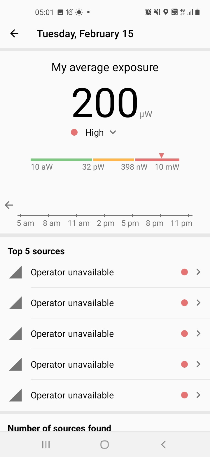 According to ElectroSmart, allegedly the most accurate app, out of the 63 sources, only three 4G antennas were from cell towers, the other 60 were in fact satellite emitters, where 31, classified by ElectroSmart as 3G, showed lethal levels of microwave radiation. They are “frying” us in installments. Proof: 4G cell tower antennas didn’t show dangerous levels (though ElectroSmart isn’t considering the dangerous accumulative effect).