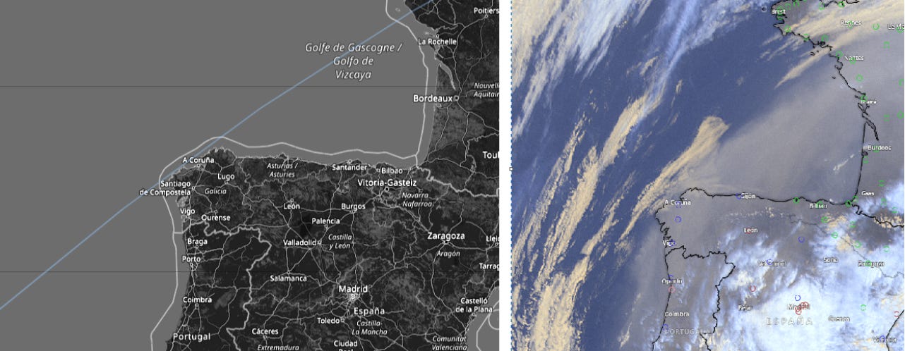 Satellite imagery show some that satellite trajectory exactly match a convex front in cloud dissipation, e.g. in northern Spain where the clouds from the Atlantic hit the continent.