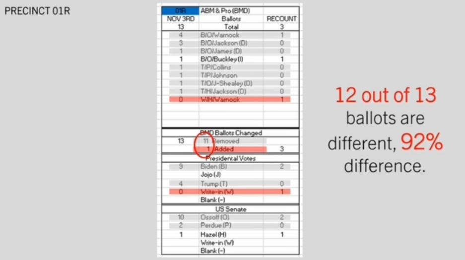 There were problems everywhere[19], but particularly in battleground states.[20] Arizona was a complete scandal, not only for losing the flash drives[21] but Georgia is a case study. [22] At least 100 thousand fake votes. [23] Former FBI special agent discovered a trove of illegal absentee votes in Georgia. [24] An image is worth a thousand words: ballots showed Trump won in Georgia, but he lost due to blatant fraud, as proven by video.[25] The same with republican David Purdue, who ran for senator.
