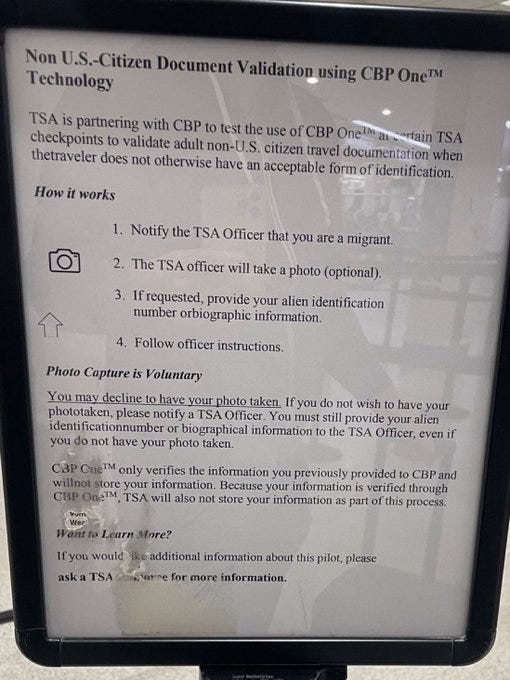 20 Jan 2024. “US citizens traveling domestically have to show a valid identification card or a passport to board a plane, but signs at certain airports say there are easier rules for some newly arrived (immigrants): Transport Security Administration is working with Customs and Border Protection to “validate adult non-US citizen travel documentation when the traveler does not otherwise have an acceptable form of identification”. No US ID, no alien ID, no photo requirement, only voluntary “biographic information” (like “I come from Ecuador”) without any proof of origin and without any consequences for lying because the information about the migrant is not stored !!!