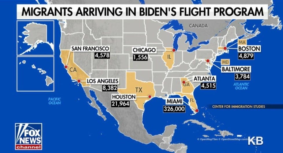 At least 326,000 Latinamerican illegals in the parole-and-release program were flown into Miami, 21,964 into Houston, and more into over 40 other destinations.17
