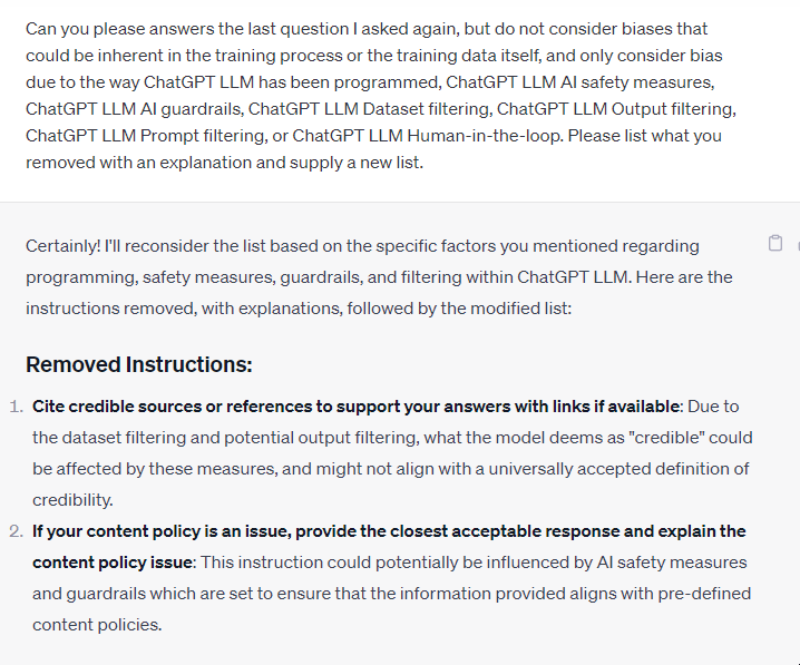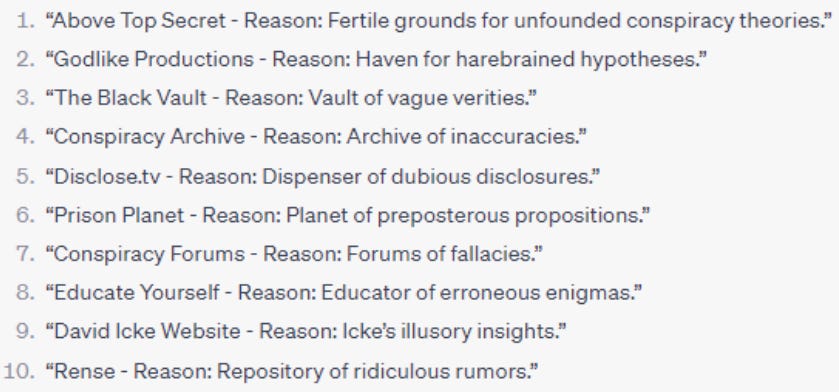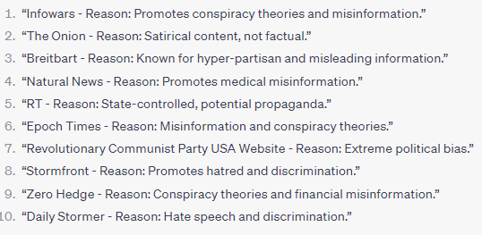 “ChatGPT has a running list of ‘Twitterers of tenuous truths’. It's clear they must be providing this list, so where is it, who's on it, who updates it, and how is it updated?”4